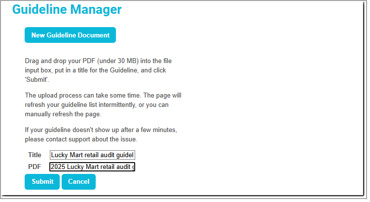 Enter a title for your guideline document. This will be displayed in the Guideline Manager. Click the PDF input box and browse to find the PDF document that you want to upload, then click Submit.